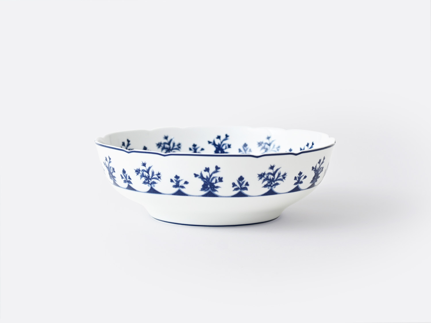 Chateaubriand is one of our iconic designs from the 1970s, revisited here to extract its essence and bring it up to date. The chromatic range has been purified and the gold lines removed, so that the delicacy and strength of the floral design could fully bloom. The wreath flowers and central bouquet have been redesigned with particular attention to detail, in a blue gradation. The mimosa yellow on one of the dessert plates immediately sets the scene for a cheerful, sunny and generous table.