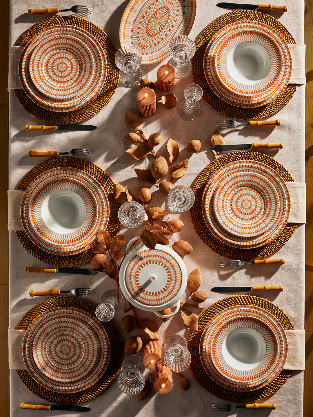 Terra Rosa est une collection joyeuse et lumineuse qui nous transporte de la Ville Rose aux confins de l’Atlas. Ce service aux nuances aquarellées dans un camaïeu de roses et d’orangés rappellent les couleurs pastel des briques de Toulouse et des tomettes en terre cuite des riads de Marrakech délavées par le temps et le soleil. Ce sont elles qui ont d’ailleurs inspiré le décor : elles dansent et rayonnent, déclinées différemment sur chacune des pièces. Superposez, jouez avec les variations et créez un effet de rythmes et de mouvements pour une table vibrante des plus contemporaines !