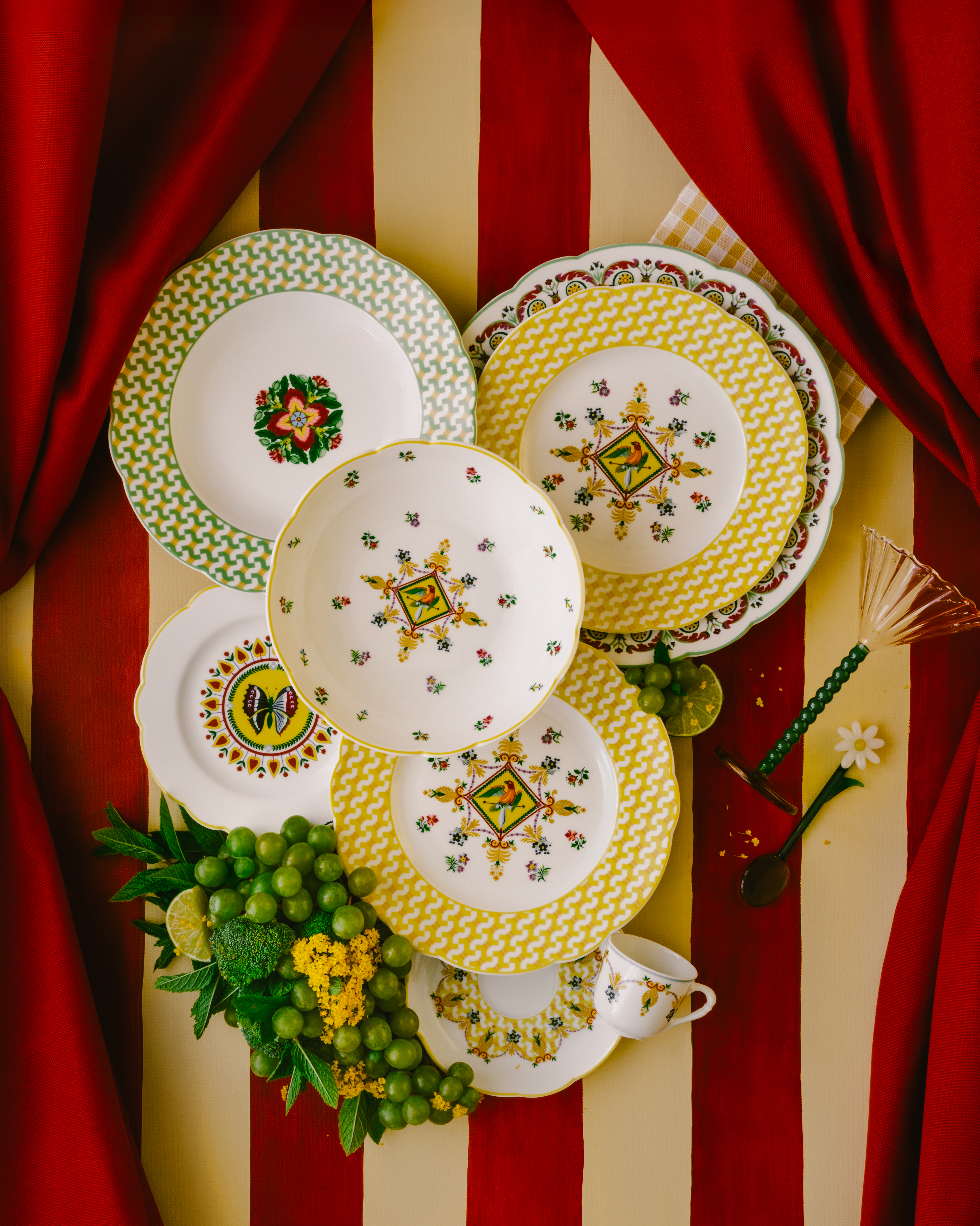 Le nouveau décor Trianon a tout d’un grand classique… revisité et surprenant ! En 1810, Napoléon, qui rêve depuis toujours de s’installer au palais de Versailles, commande 80 000 mètres d’étoffes aux soyeux lyonnais, créant ainsi un répertoire décoratif foisonnant et inspirant. La commande fut livrée deux ans plus tard, seulement trois mois avant l’exil de Napoléon à Sainte-Hélène. Ainsi, ces tissus ne furent jamais utilisés et sont conservés depuis au Mobilier national. Avec Trianon, la maison Bernardaud pose un nouveau regard sur cet inventaire de formes. L’association de damiers noués de rosettes, de saynètes festives, d’un papillon ou d’une fleur confère au décor une grande liberté de ton. Cette rêverie ornementale inachevée prend désormais vie sur un service offrant de multiples combinaisons, pour une table aussi gaie que chatoyante.